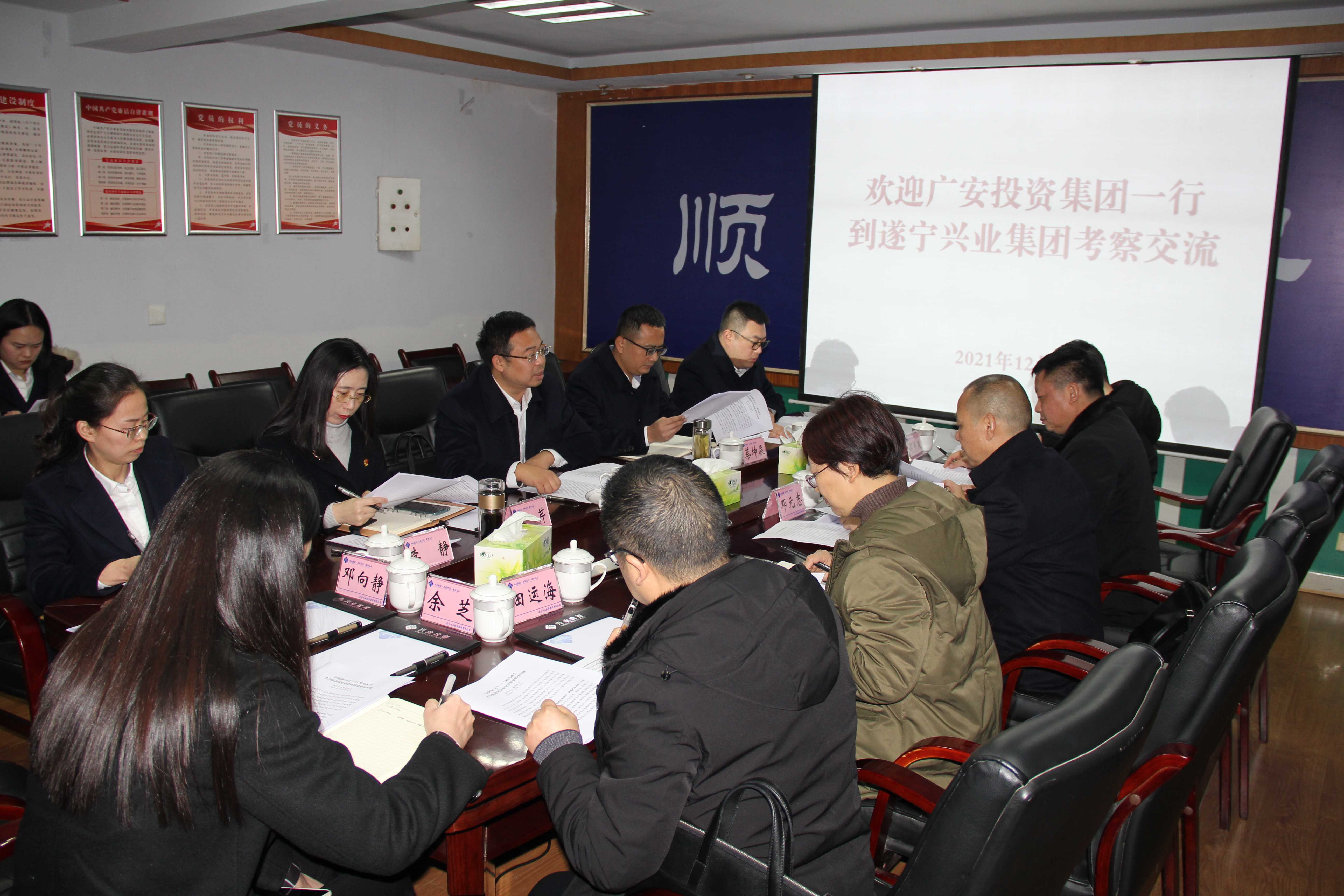 ? ? 2021年12月28日,廣安投資集團(tuán)黨委專職副書記鄧元志,黨委委員、紀(jì)委書記李桂瓊一行7人到遂寧興業(yè)集團(tuán)考察交流學(xué)習(xí)。集團(tuán)黨委副書記、監(jiān)事會主席、工會主席石鎮(zhèn)槐,集團(tuán)黨委委員、紀(jì)委書記蔡坤辰陪同考察,并參加座談交流。? ?