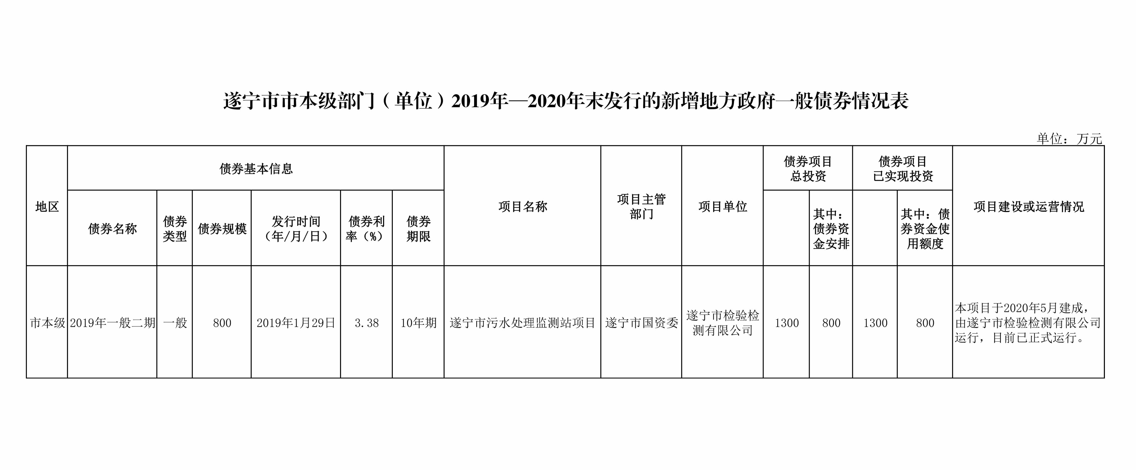 ? ? 根據(jù)財政廳關(guān)于印發(fā)《四川省政府債務(wù)信息公開實施細(xì)則(試行)的通知》(川財債〔2019〕9號)文件要求,現(xiàn)將我單位2019年—2020年度存續(xù)期內(nèi)地方政府新增債券資金使用、項目建設(shè)進(jìn)度、運(yùn)營情況公開如下。